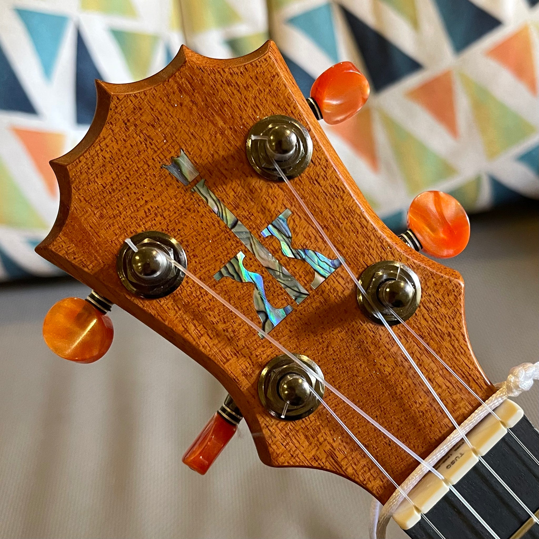 ・エボニーのヘッドプレートにアバロニ貝のインレイでコアロハのロゴ